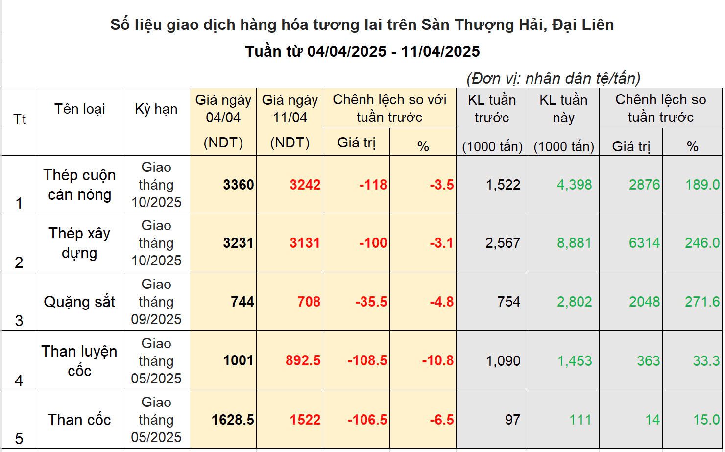 Thị trường tiếp tục rơi mạnh trong 2 ngày đầu tuần do việc Trung Quốc đáp trả mạnh mẽ các mức thuế đối ứng của Mỹ. Về phía Mỹ, ông Trump lại tiếp tục nâng mức thuế lên 145% viêc này như đổ thêm dầu vào lửa khiến đối đầu thương mại Mỹ – Trung càng thêm nghiêm trọng. Trong tuần, Chính phủ Trung quốc cũng thông báo sẽ đưa ra những gói chính sách vỹ mô để hỗ trợ thị trường vốn, hỗ trợ tăng trưởng. Tâm lý thị trường đã bớt tiêu cực và cân bằng trở lại. Chốt tuần giao dịch, giá thép giảm 3%, quặng sắt giảm trên 4% và giá than giảm 10%.