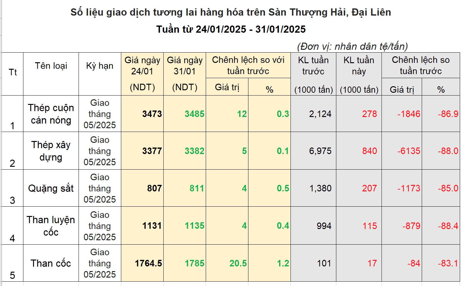 Tuần giao kết thúc với 1 phiên duy nhất và đóng cửa nghỉ tết. Giá các mặt hàng sắt thép, quặng sắt và than cốc đều tăng điểm nhẹ. Giá thép tăng 0.3%, quặng sắt tăng 0.5% và than cốc tăng 1.2%. Khối lượng giao dịch tiếp tục ở mức thấp.