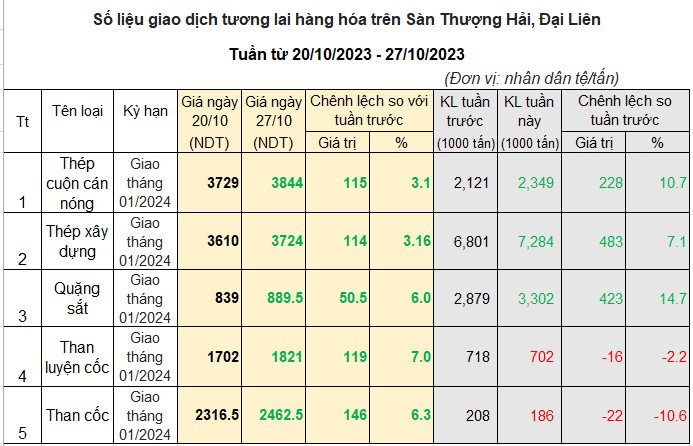 Kết tuần, giá thép tăng 3% , quặng sắt, than tăng 6%. Khối lượng giao dịch cũng tăng trung bình 10% so với tuần trước.