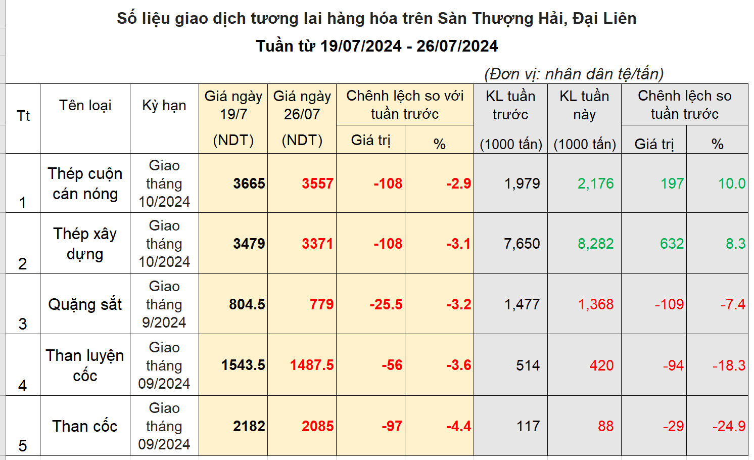 Bất chấp việc Ngân hành trung ương Trung Quốc liên tục hạ các loại lãi suất đìều hành để kích thích nền kinh tế, Thị trường thép future vẫn duy trì trạng thái giao dịch tiêu cực tiếp nối từ 2 tuần trước, do lo ngại nhu cầu chưa hồi phục. Đặc biệt, phiên thứ năm, có thời điểm giá thép đã giảm mạnh, Hrc về sát 3500 NDT, chạm mức thấp nhất kể từ đầu tháng 4/2024. Trong phiên cuối tuần, giá thép đã có sự hồi phục tương đối mạnh, thu hẹp mức giảm trong tuần. Kết thúc tuần, giá thép, quặng sắt giảm 3%, giá than giảm gần 4%. Khối lượng giao dịch thép tăng 10% trong khi quặng sắt và than giảm mạnh.