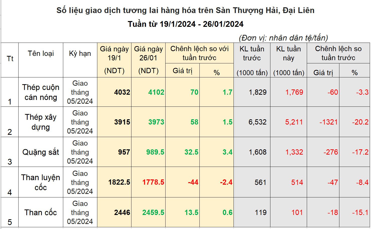Giảm nhẹ trong phiên đầu tuần, sau đó tăng liền trong bốn ngày cuối tuần, giá hàng hóa có thêm một tuần tăng điểm đều trên tất cả các mặt hàng. Đà tăng giá đến từ sự kỳ vọng vào các chính sách tài khóa, tiền tệ mà Chính phủ Trung Quốc liên tục đưa ra để kích thích nền kinh tế. Vào ngày 24/1 Trung Quốc công bố quyết định sẽ hạ tỷ lệ dự trữ bắt buộc đối với các Ngân hàng thêm 0.5%, bắt đầu từ ngày 5/2/2024. Điều này sẽ giải phóng khoảng 1.000 tỷ NDT tương đương 140 tỷ usd để bơm vào nền kinh tế.