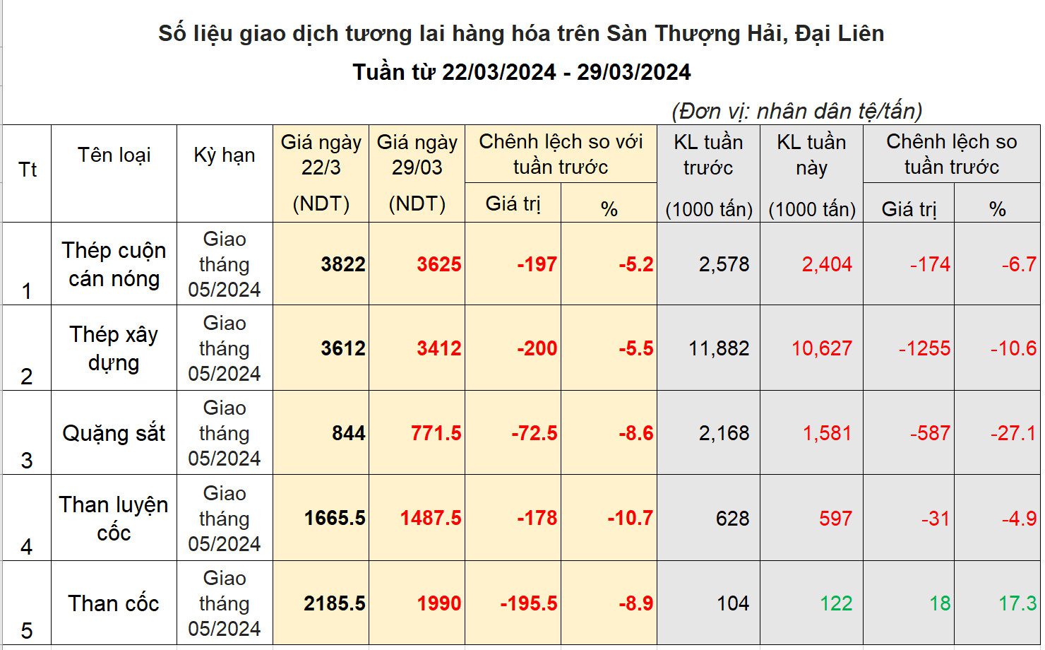 Tuần trước, thị trường đã có sự hồi phục sau chuỗi 4 tuần giảm giá. Bước vào đầu phiên giao dịch tuần này, giá đã tăng trong giờ đầu tiên nhưng đã nhanh chóng giảm trở lại sau đó. Lo ngại cung tăng mà cầu không được cải thiện đã kéo giá các mặt hàng giảm đến hết tuần. Chốt phiên cuối tuần, giá thép giảm 5%, quặng sắt giảm 8% , than giảm 10%. Thanh khoản tuần này cũng giảm nhẹ so với tuần trước.